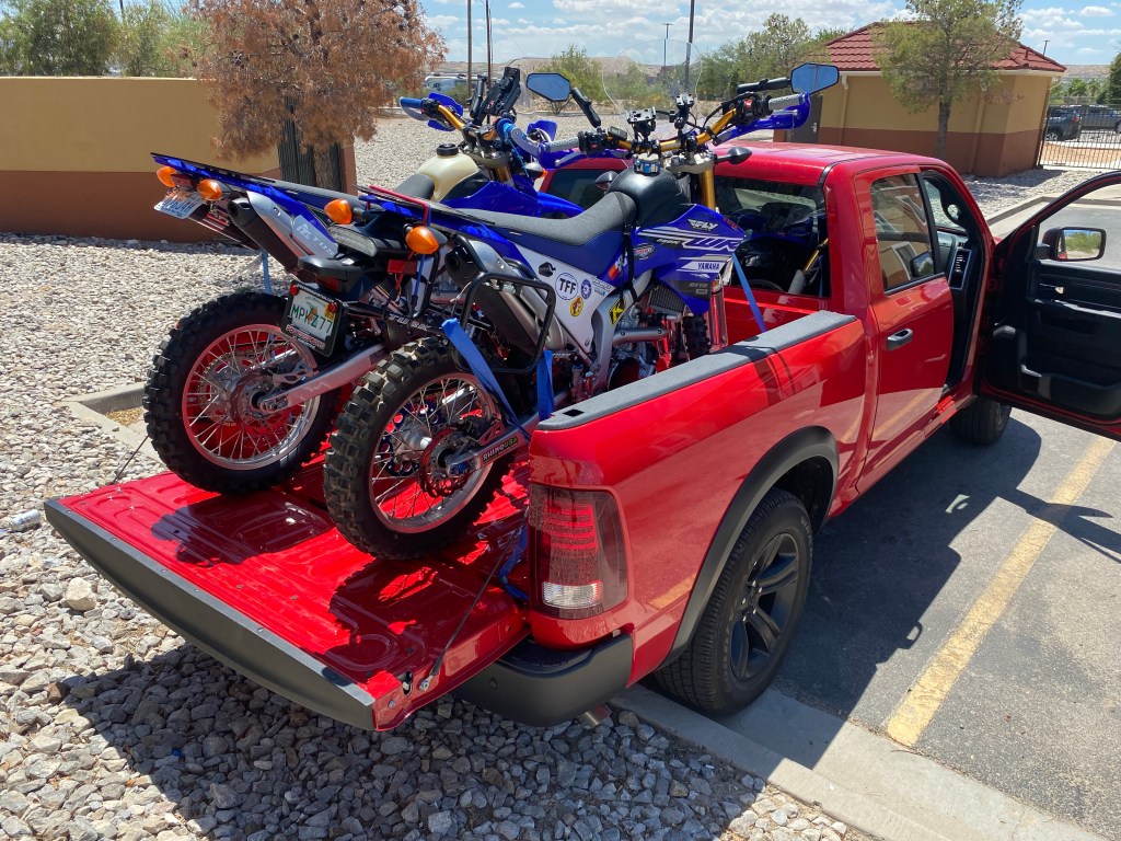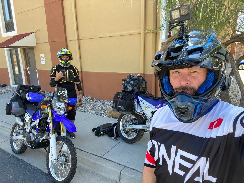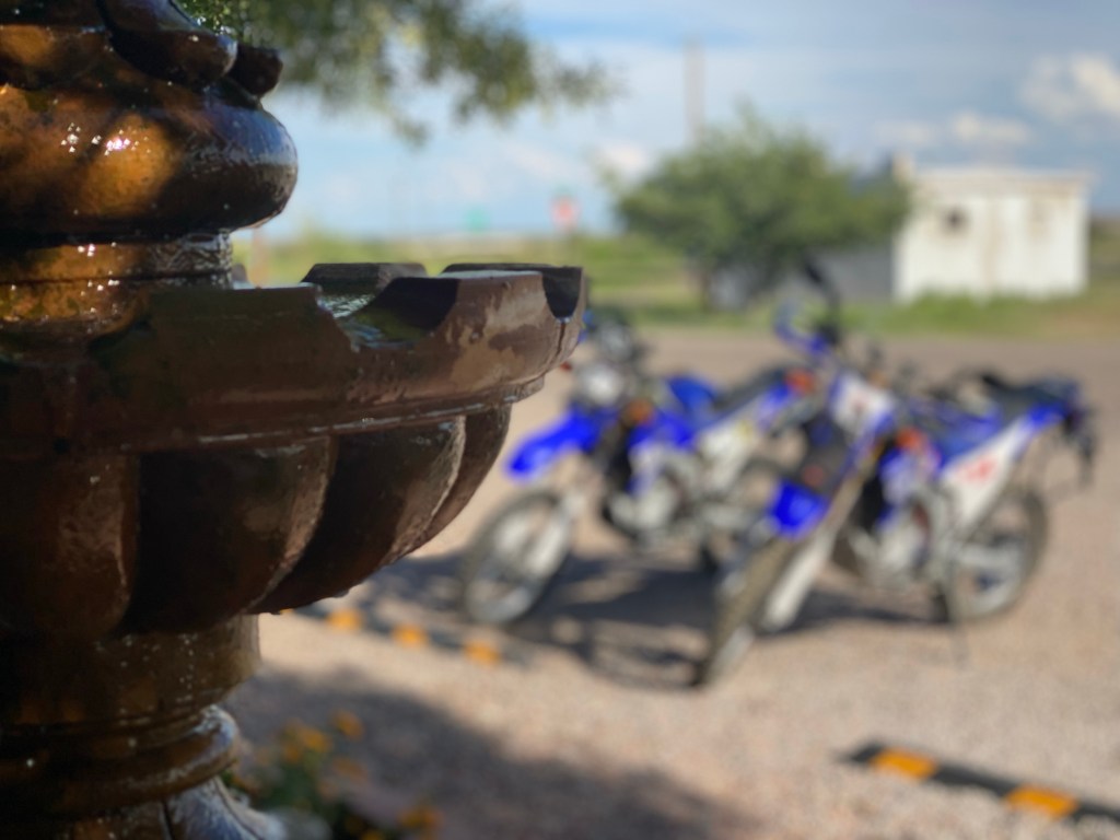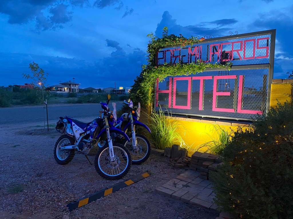 This afternoon we rode out of El Paso and headed to Columbus, NM for the night. We didn’t have a ramp to get the bikes out so we drove to the back of a hotel in El Paso and used their rock landscaping to assist. Even got all our gear on and luggage loaded there. If all goes as planned this will be the only hotel night of the trip. We didn’t get in until 5 and we still needed a night to go through gear, tighten bolts and work through mechanical and electrical issues that popped up on the 1 hour plus ride here from El Paso. We found this little 6 room hotel (think it’s the only one in town) a month ago online and booked it. We grabbed a bite to eat across the street at a little diner and just relaxed after that. Today was the easy day compared to what’s to come. We’re both beat and about to call it a night. Want to be up, loaded and on the road early so we can get to the starting point at a decent time.