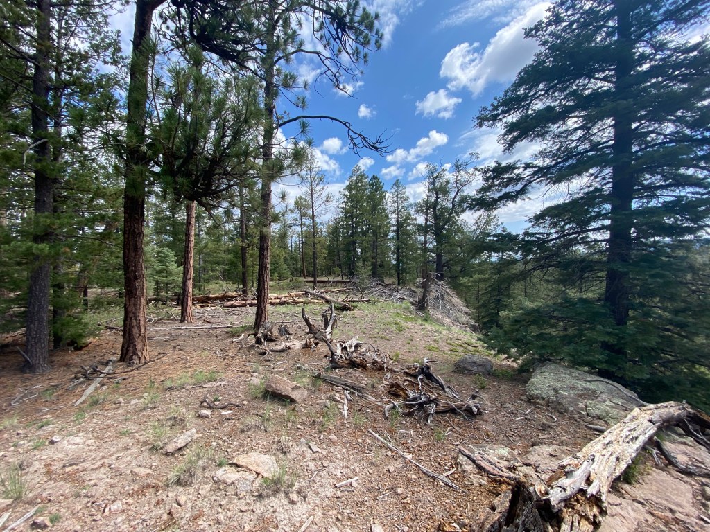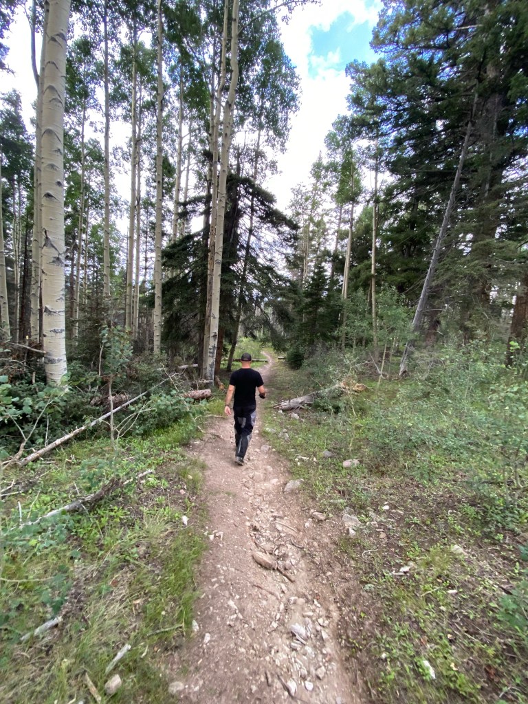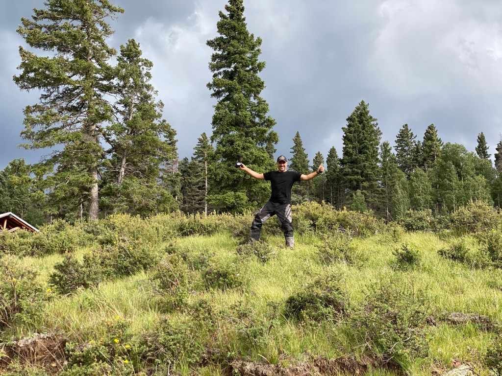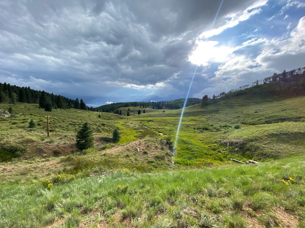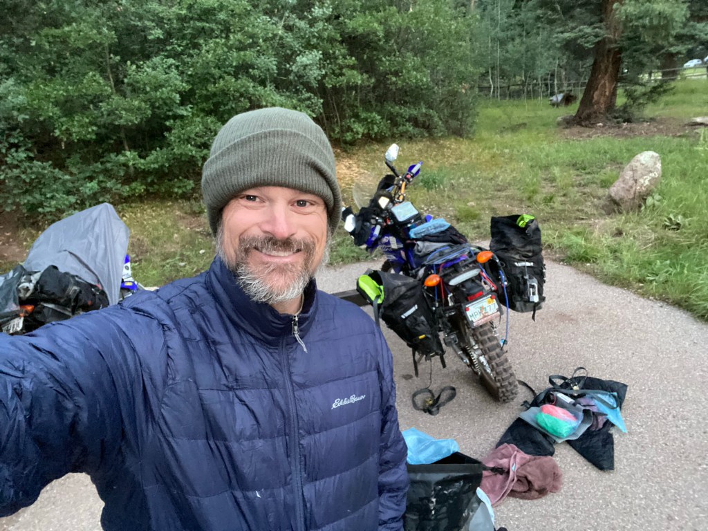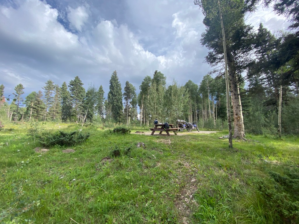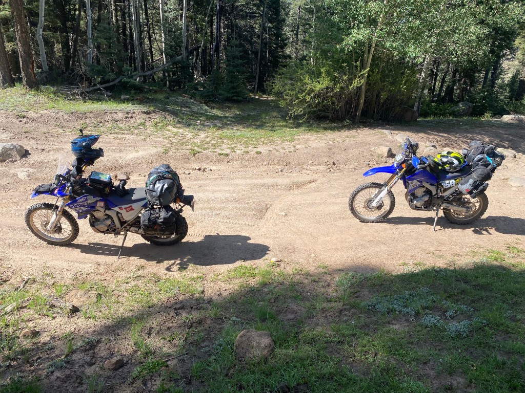 We started the day just east of Cuba, NM at Clear Creek Campground. Today was rough on the bikes and on us. We had two red sections (if you ski or snowboard it’s the equivalent of a black diamond) around the Santa Fe National Forest. Actually, if I remember correctly (it’s all a blur) one of the blue sections was more technical than an average red and we are thinking it was mislabeled in the gps tracks we bought. I think I dropped the bike 3 times today trying to go over some of those obstacles. Matt probably did the same. There are 10s of 1000s of rocks ranging from golf ball size to others as big as a laundry basket. Mix that with steep inclines/declines and massive ruts created by recent rains and that makes for an interesting run. The ruts not only go in the direction of the trail, but also across. Some of the ruts going across were a foot to 2 feet wide, foot deep and at different elevations. Either had a drop down or step up and this was going up and down hill. Cracking the throttle in 1st/2nd and pulling up on the handle bars were key for those. Not too many lines to follow so you just go for it and hope for the best. The plastics around my radiator guard ripped off so I had to punch 4 holes in the plastic and zip tie it together. Good as new! Both hand guards are scraped up and the left and right pannier bags are taking a beating as well but at the same time act as big cushions for when the bike does go over. It’s amazing what that little 250 can do when modified with a different gear set and heavy duty race suspension. Beyond impressed with its 1st and 2nd gear capabilities; especially with all the weight we have on these things. It’s about applying constant torque, keeping momentum, following the least shity line and keeping the rubber on the ground. That bike is a damn mountain goat. I bounced off the ground a couple times, but it’s all part of the adventure. Nothing Advil can’t take care of plus it makes for some great GoPro vid. We were probably 3 minutes outside of Abiquiu, NM when it started to sprinkle and then right when we pulled up to get gas it just started pouring plus lightning/thunder to the extent it knocked out the power a couple of times while we were there. Needless to say we hung out there for awhile to wait it out. It was more of a general store so they had a little of everything so we didn’t mind hanging out. We sat on a bench out front and finally had a chance to play on our phones plus we tracked the storms on radar and researched campgrounds for the night. The storm finally passed so we geared up and took the road to a place the gps said was a campground, but nope no campground so we kept on riding. Matt had the gps map up for the campground and I had the real time weather radar up on mine. It looked like we were going right between two storms as we rode. We left the hard pack and jumped back on the trail and eventually found an established campground at 9800 feet. We talked to the camp host and he set us up with a spot for the night. While on site we walked down to a nice little mountain lake on a path through the forest. The views were just amazing. After that we went back to the site and setup camp. While we were setting up, the skies got dark, the thunder rolled in and it started to sprinkle. No more than two minutes after I closed my right pannier bag the rain came in so we each went to our tents and called it an early day. Didn’t get to start a fire or heat up dinner. Think I had trail mix, water and a Kind bar instead. No idea when I passed out, but it was early. The sound of the rain hitting the tent was calming and I fell asleep. It’s now 3:57 am and I’m wide awake. This seems to be my norm on this trip. Perhaps I’m still running on EST in my head. This is when I work on the blog, go through all the pics from the prior day, swap out SD cards, make sure everything is charged, study the map for the day and figure out possible fuel stops. As each day goes by we are getting a little better and quicker breaking down camp and loading up the bikes. Loading the bikes is all about even weight distribution and having frequently used items on top for easy access such as tools, first aid kit, shoes, etc. It’a no doubt an art you only learn by doing it over and over and over. Today we should hit CO. Right now my Garmin in-Reach says it’s 47 degrees with a 30% chance of rain. Knowing it rained all night we are expecting slick and muddy trails ahead. Thinking the bikes are about to get dirty again. I’ll post this later today once I have a cell signal. I could use a shower, the baby wipe camping kit is wearing its welcome out.