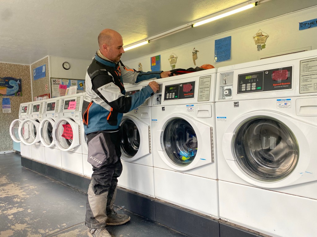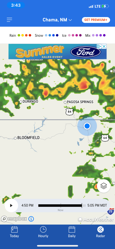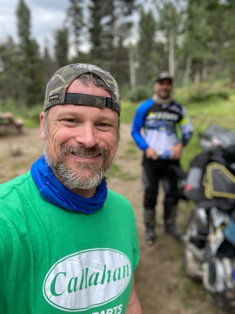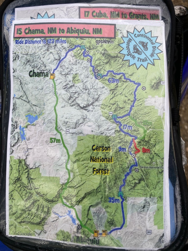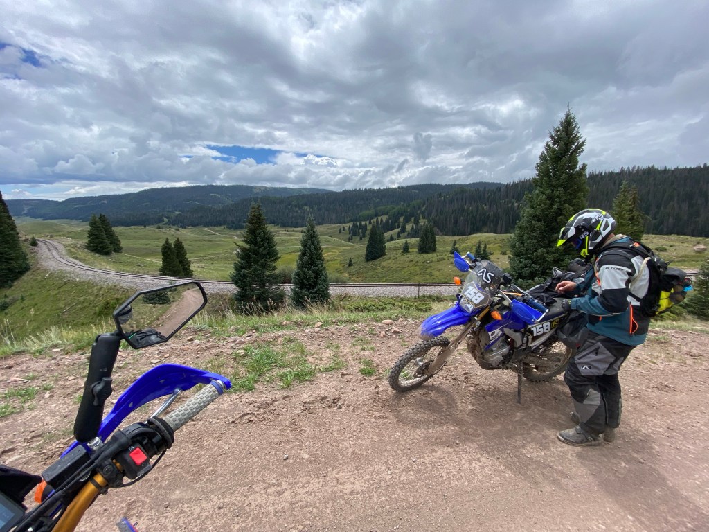 We made it to Chama and found a car wash. The bikes were packed full of mud and we had to blast all of it off. Last thing you want is for the mud to dry on the forks plus it needed removed from the radiator and around the brakes. From there we tried to find a place to eat. We went to a couple different places but they were all closed. Restaurants there have lunch hours and dinner hours and closed in between. Our only option was subway. After subway it was time to hit the trail again. Rode about ten minutes out of town and straight ahead were a couple of massive storm cells so we turned around and went back to town. We found an old abandoned store of some sort off the main road that had an overhang so we parked the bikes in the shade and started to call hotels. We called at least 5 places and they were all booked. There was a legislation committee event going on in town and all the rooms were taken. We finally found one that was a combo RV park/hotel so we went there. It was pretty sketchy but it worked. Once settled in we made a laundry run since we had the time. Once back from doing laundry I noticed my back brake didn’t work. We looked at it and discovered the brake line had failed. There was a leak at the fitting by the brake assembly. We started to research motorcycle repair shops between the hotel and the trail system and there really weren’t any. We had two options, Go way out of our way to Durango, CO to a Yamaha dealer or Pagosa Springs, CO and find a custom shop and see if they could work their magic. I had left a VM at the Yamaha place in Durango as a heads up just in case we headed that way but that wasn’t option 1. It was too late in the evening to call the shops in Pagosa Springs, but there were a couple of promising shops that could probably fix it. At this point we had a plan and went to bed. Oh, the long overdue shower was amazing!