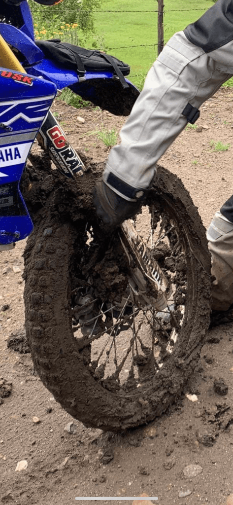 After we filled up, we lowered our tire pressure knowing the trails were wet from recent storms and we were going to hit rock trails after that. From there we had some great valley and mountain trail riding. It wasn’t too technical but still a blast. We headed out of town and once on the trails we ran into the nastiest mud we’ve seen so far. It was extremely sticky, immediately encased the tires, filled the rear spring area with mud, encased the forks and was packed all around the front sprocket. It was horrible to the point it actually added weight to the bikes and made the tires worthless. I had to get a stick and carry it with me to scrape mud out from everywhere.