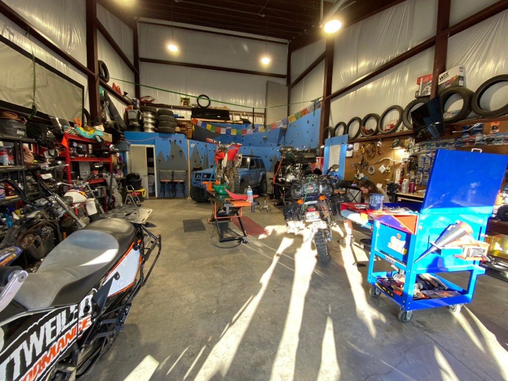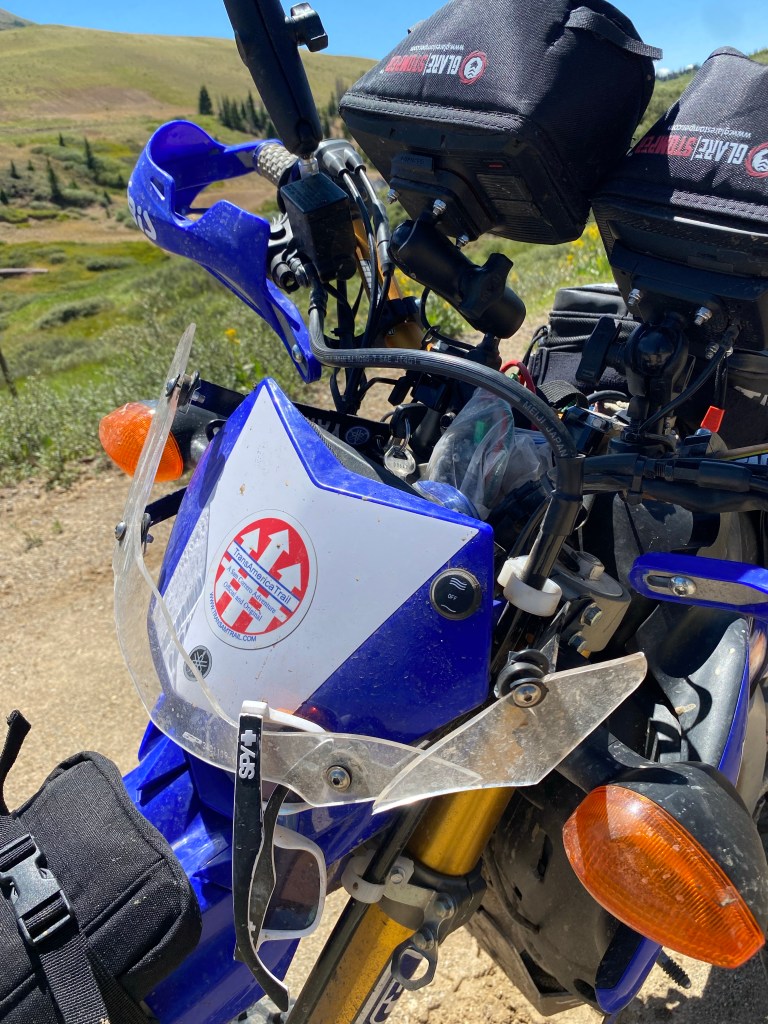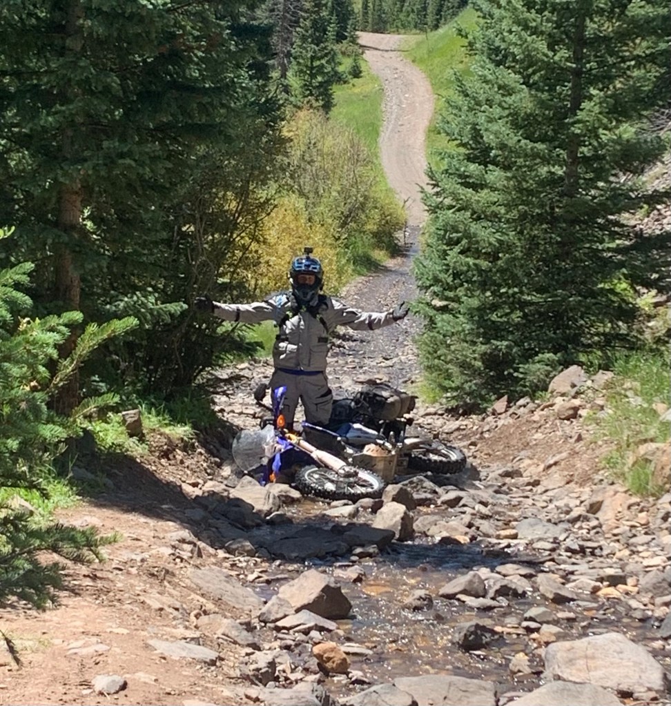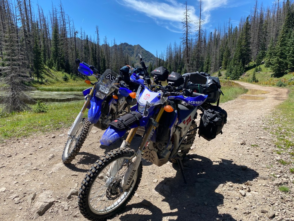 Today was a little different than normal because my bike needed some repairs and that was an adventure all to itself. We got up early, packed up the bikes and left the hotel around 6:30. We had to take the highway from Chama to Pagosa Springs. Remember, it’s dark, I don’t have a back brake and for shits and grins it was REALLY foggy and we had 3 deer and 2 elk jump out in-front of us on the way-that was fantastic 😑. The condensation was so bad we had to constantly wipe off our visors so we could see. Visibility was horrible, but there were a handful of clear spots and the terrain looked like something out of a movie. The mountains, streams, valleys and windy roads were just amazing. When we pulled into Pagosa Springs I pulled up motorcycle repair shops on my phone and Grand Venture LLC popped up so I called them. David answered the phone and told us to stop by and he would do what he could to fix it. As a reminder, my rear brake line had a failure where the rubber connects to the fitting. Right off the bat he told me he didn’t have a line for a wr250r, but he could probably fix it anyways. After a little recreational gps user error tour of Pagosa Springs we finally pulled into David’s shop. It had one single garage door, but was at least two car lengths deeps. There were multiple bikes. parts, tools and a heavily modified Jeep sitting in the back. Both David and Jeremiah met us outside, greeted us and were two of the friendliest guys out there. Couple minutes into conversation you can tell those two eat, sleep and enjoy the adventure motorcycle lifestyle. David fixed my bike by taking an 18 year old brake line from his personal Honda 650 and making one small bend in it. It was the right length, same fittings and hooked right up. Who would of thought? He also worked a small oil leak I had going on and changed my oil. The entire time he was working on the bike all four us were just BSing about riding and Jeremiah and David showed us their heavily modified bikes. While there, JP from MissionWildweness pulled up in this ridiculous 4Runner and it was probably the most built up off road Toyota I’ve ever seen. We started talking bikes and turned out JP has a Tenere 700 which is the same bike I have in order plus David has one sitting out front. He has an interest in my bike and might be interested in buying it off me once the trip is over. When the bike was fixed we all took a pic together and then David and Jeremiah suggested we all ride down the street and have breakfast so we did. David jumped on the Tenere 700, cracked the throttle and pulled quite the vertical wheelie and Jeremiah jumped on the KTM. Hands down David’s shop is a top tier repair/customer shop and I’m lucky he was in town. At breakfast more riding stories were exchanged and David suggested we take a difficult scenic route to get us back on our trail system. The trail was called Wolf Creek Pass. Matt and I decided we would take the route, do a little site seeing and get back on the trail. Well, 20% of that trail was a bitch and personally the hardest trail I’ve ever been on. The water crossings were fun, the moderate trails were exciting, but the super steep, rocky, loose gravel and cliff drop off to the immediate right was kinda scary. There was one spot I laid my bike over and it started to slide backwards just to show how steep it was. We took all my luggage off , walked the gear up and then finally got up that section. There were step ups in an already vertically challenging obstacle and there were no doubt some tense moments. I had cracked my wind screen in NM, but this trail claimed it and it’s actually still sitting up there somewhere. All in all it was a great learning experience. Still amazed on what that little wr250r can do with a few modifications. Matt and I have done quite well on the hard legs of the CDR, but this particular trail had a section that was well beyond our skill level with loaded down bikes, but slow and steady wins the race and we eventually completed it. From there we traveled to a town called Del Norte, had lunch at a brewery, talked about the crazy trail we were just on and had some beer. After that we headed north again. These trails were all dry gravel and fast with switchbacks and hills. It was so fun to hit those at speed. We eventually ended up at another campground up in the mountains and it great. There was a stream down the hill and maybe 9 spots total.
