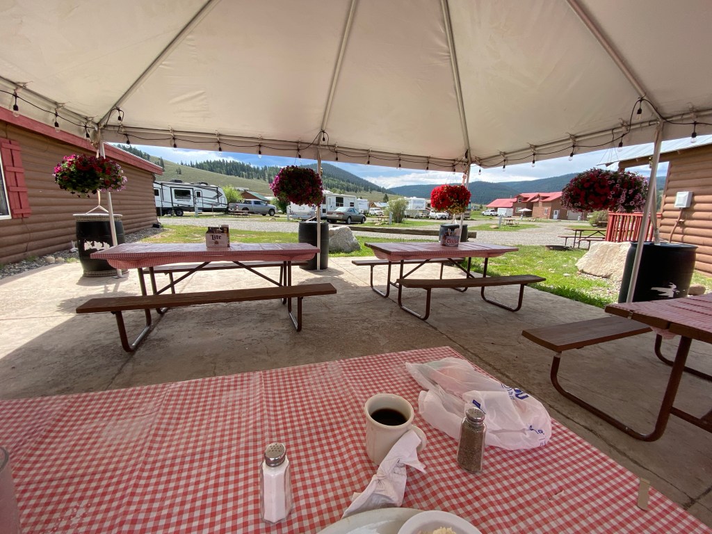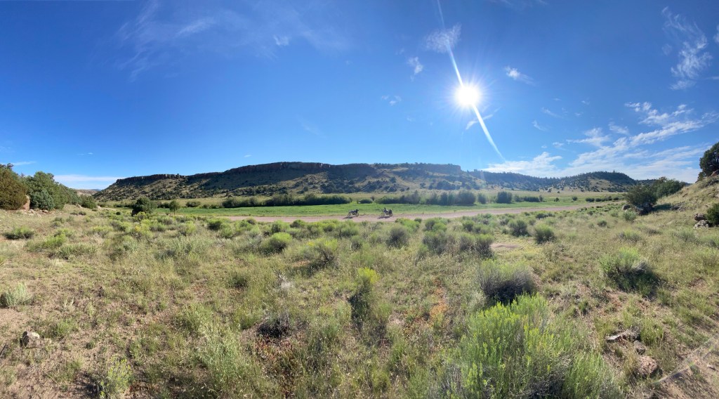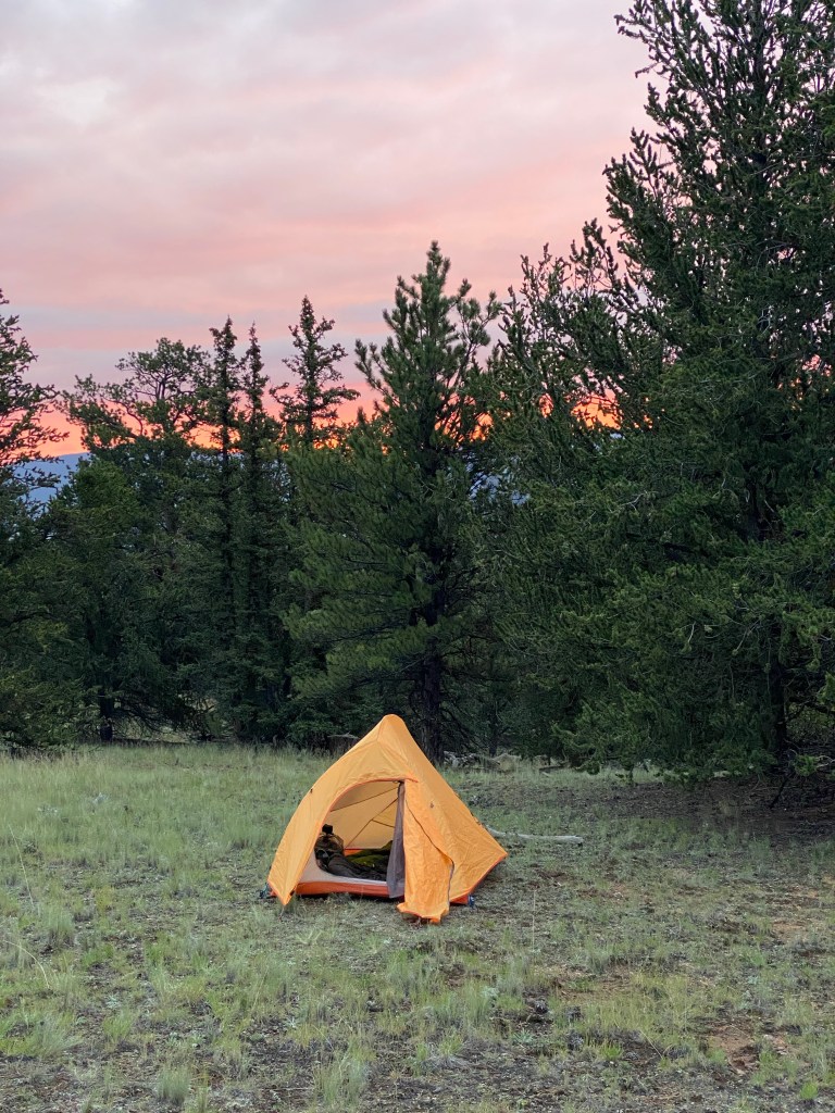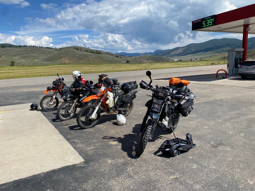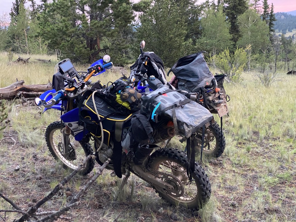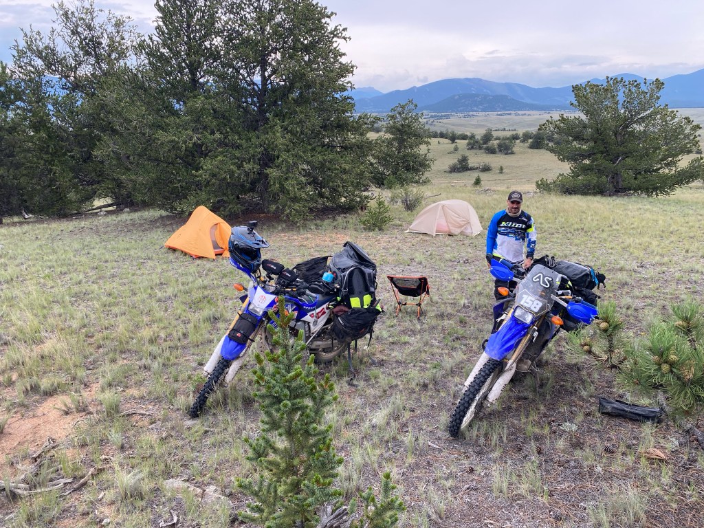 This morning we woke up, fired up some coffee, broke down camp, loaded the bikes and departed camp. It was 45 degrees so we both used our grip warmers. After traveling north on the trail system for a bit we came upon a old gravesite in the middle of nowhere. Of course we stopped and had to check it out. The oldest grave was from the mid 1800s. After that we made our way to Sargents, CO where we stopped for gas and lunch. When we pulled up there was a group of adventure bike riders taking a break from their journey. I believe they were riding the Trans America Trail which is a multi week coast to coast trail system. while there I ordered the elk meatloaf and it was excellent! After lunch we continued on the trail until we needed gas again and found ourselves at a Walmart in a town I can’t recall the name of. Matt needed a pair of cheap shoes since one fell off the bike somewhere and my water bladder sprung a leak so I needed to replace it. When we go to places like Walmart we usually go in one at a time while the other babysits the bikes. We don’t need a Garmin or other things walking away. Matt went in first and then I went. Apparently it started raining hard when I was in there but there wasn’t any lightning so we decided to press on with the trip versus wasting more time waiting it out. It was a cold rain so we put our visors down, put the grip heaters on high and headed out of town and jumped back on the trail system. The trail was a mix of mud and gravel with multiple switch backs in the beginning, but eventually straightened out and was all gravel. It was cold, wet and in some spots slick. There was a little sliding going on. We probably had this for 30 plus miles. All along the countryside were established ranches and then there were campers all over the hillsides for miles on end. The next stop was Salida. By this time we wanted to top off on gas, get something warm to drink, warm up for a bit and figure out where to camp for the night. This dot on the map is known for their Buffalo and of course we saw a ton of them outside of town. I ran into a guy that was an F15E strike eagle pilot so we chatted it up for a bit and turns out he was stationed in NC a few years after I was there and was even in the same squadron. While still at the gas station we dug out our winter riding gloves and put away our soaked leather gloves. Probably should have done that hours prior, but no biggie. Matt found a wild camping area quite a ways down the road so we set our gps units to the general area and headed out. Luckily the skies had cleared up by this point. We found ourselves on this sand/dirt path probably 6-7 feet wide full of twists, small jumps, dips. Etc., and stayed on that for quite awhile. We eventually left the trail and cut across the landscape until we found a spot we wanted to camp at. The views were just amazing and there wasn’t a vehicle or soul to be seen in any direction. There was another dirt bike that flew by after we arrived but that’s it. We unloaded the bikes, set everything up, took a ton of pics and then hung the bear bag a few hundred yards away. After that we crashed. My Garmin in reach said it was 44 degrees as a low.
