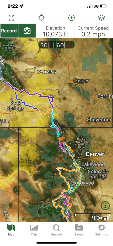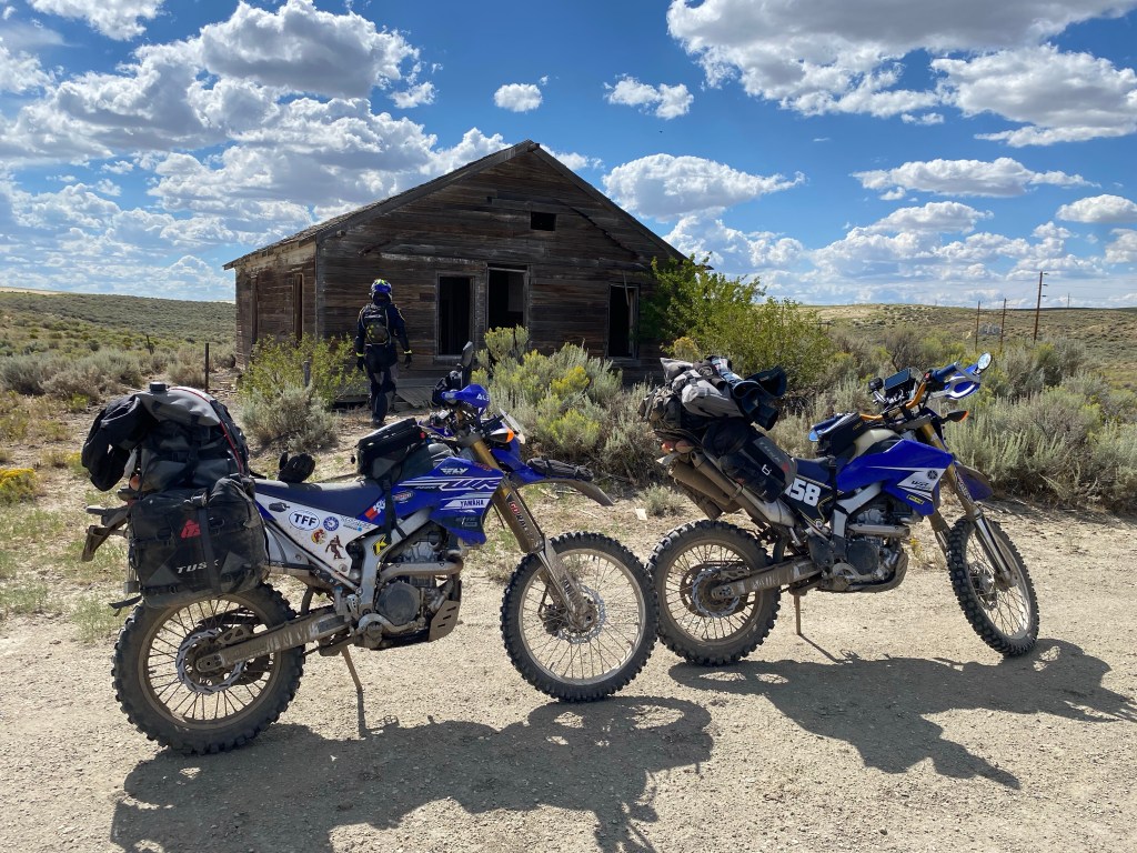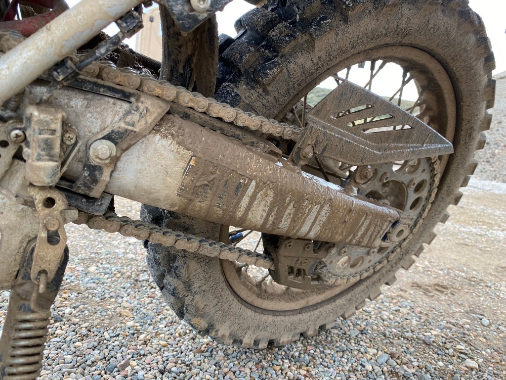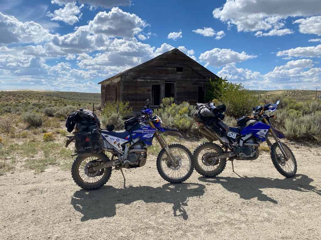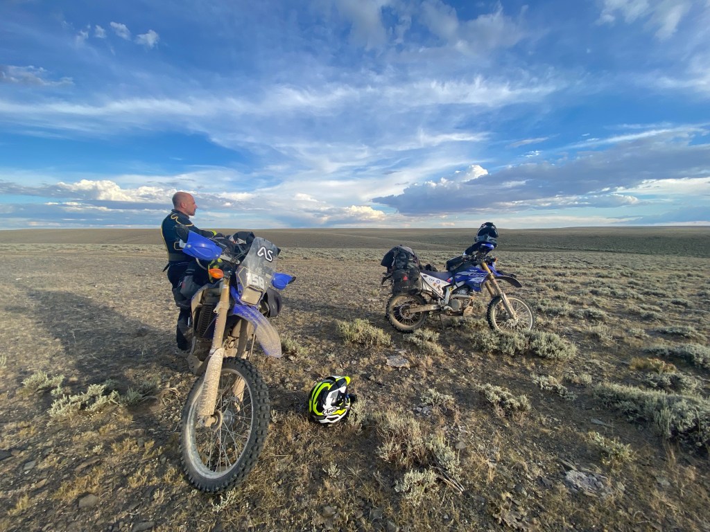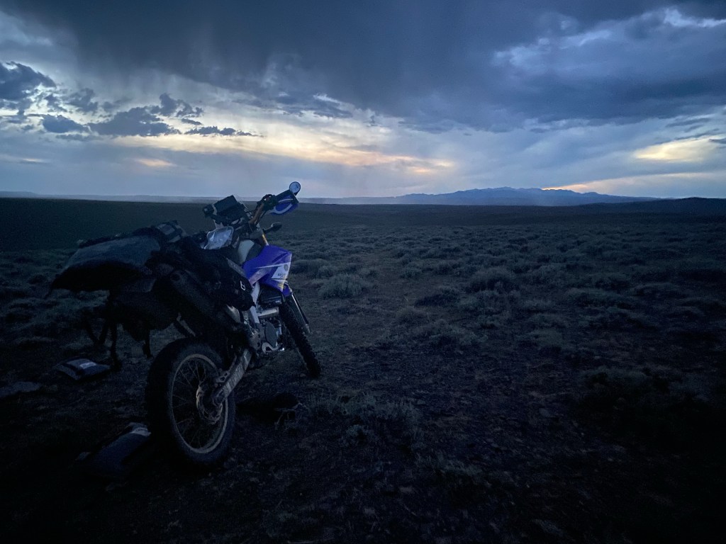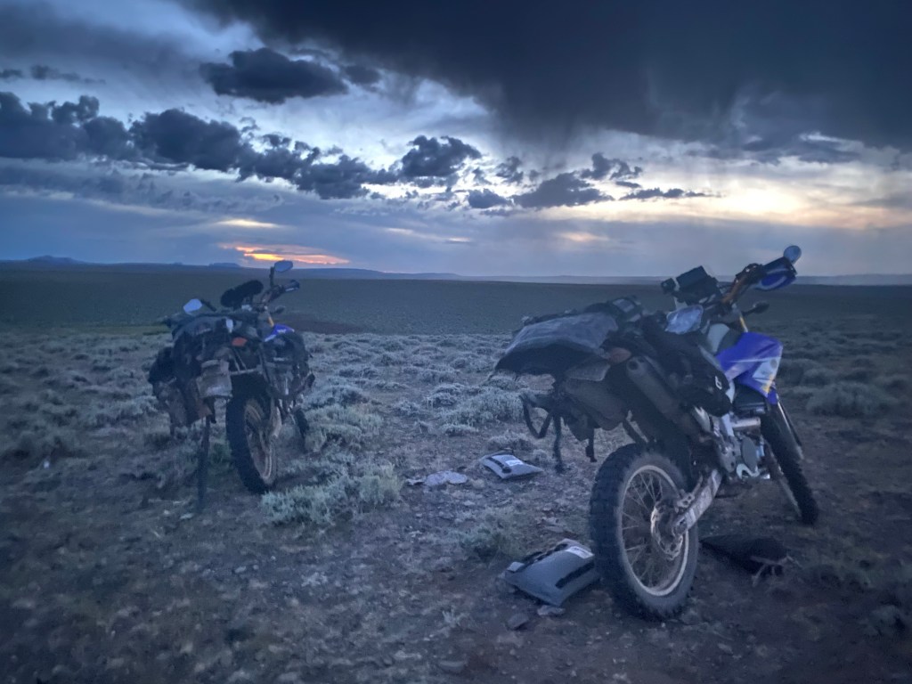 This morning we woke up from our 9300 foot mountain camp east of Steamboat Springs and headed back to town for gas, breakfast and water. We ate outside at a little restaurant. From there we took a series of scenic backcountry roads and eventually made it to Wyoming. Some of Those roads were extremely muddy, not like the sticky mud we hit a few days earlier, but still messy. We were in this for quite a while. Rawlins was the last gas station before our 225 mile cut across the desert. We each bought a 2 gallon fuel bag while planning this trip so we filled those up, strapped them to the bikes and headed into the desert. Our bikes have 3 gallon tanks with a range of about 180-190 miles. The trails consisted of gravel roads, and deep sand. A couple of hours in we ran into a group of guys headed south. We exchanged map information and each we r on our way. We went about 140 miles deep into the desert before we started to look for a place to setup camp. We found a spot, setup our tents, started to make dinner and out of nowhere a massive wind/rain storm came in with very little notice. We grabbed everything we could and jumped in our tents to wait it out. Our tents would have been long gone if we weren’t inside of them. 15 minutes later it was calm again.