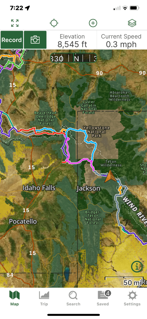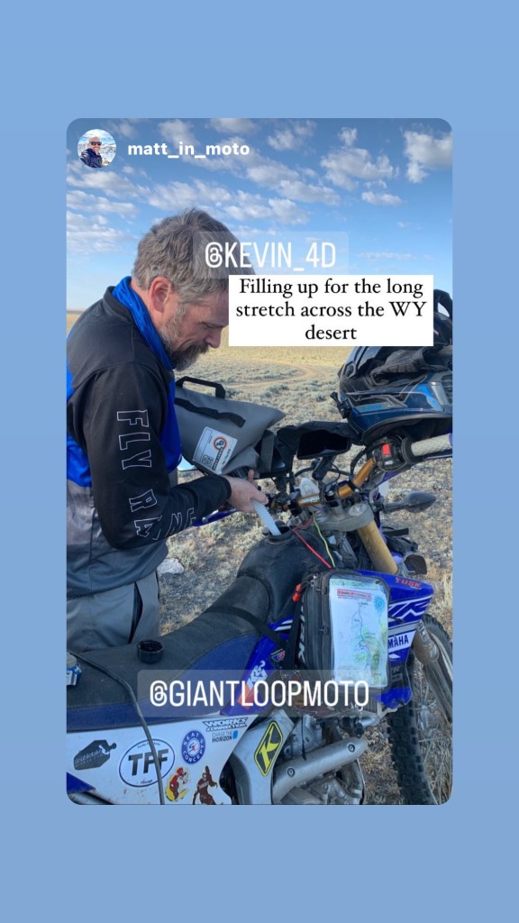 I woke up for no good reason around 3:30 so I went outside and the night sky was a combination of the deepest black with the brightest stars I’ve probably ever seen. There were so many different details in the sky you just don’t see being near a city. Went back to bed and woke up a few hours later. As we were breaking down camp we had two wild horses come check us out and just stare at us the entire time. We would turn our backs to work on the tents and they would come a little closer. There was a white one and brown one. They did this a few times. When we finally jumped on the bikes and left they ran along aide us for a short time probably 60 yards to our left. I was able to get it all on go pro. It was a long ride out of the desert to gas/civilization. We knew the desert stretch was the longest distance between gas stations (225 miles) the entire trip so we had to fill up our 2 gallon Giant Loop gas bags and strap them to the back. The roads out of there were combination of soft sand, rock, gravel, and old roads. We went by old mining towns from the 1800s with buildings and equipment just left as of operations just stopped one day and everybody left. The highlight of the day was ascending and descending through the Grand Tetons. The magnitude of the entire landscape was just amazing. Due to storms, and the desire for a shower, laundry and perhaps a drink or two we decided to get a room at a lodge in Moran, WY. It was nice to repack our pannier bags, and relax for a few. My laundry was so bad I had to buy a gift shop tee shirt so I had something to wear while doing laundry. We ended the night down in the lodge bar with a couple drinks and I had the Elk meatloaf sandwich.