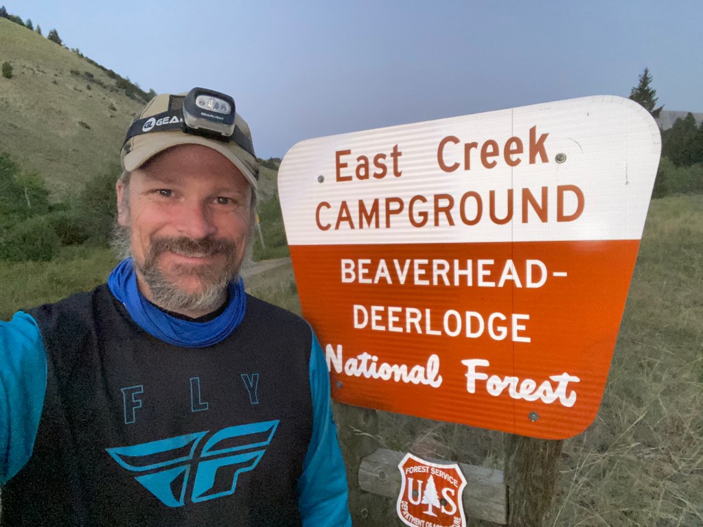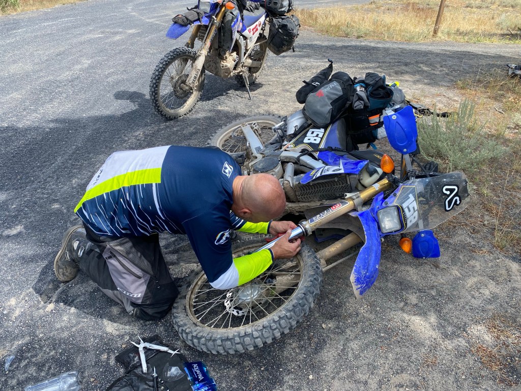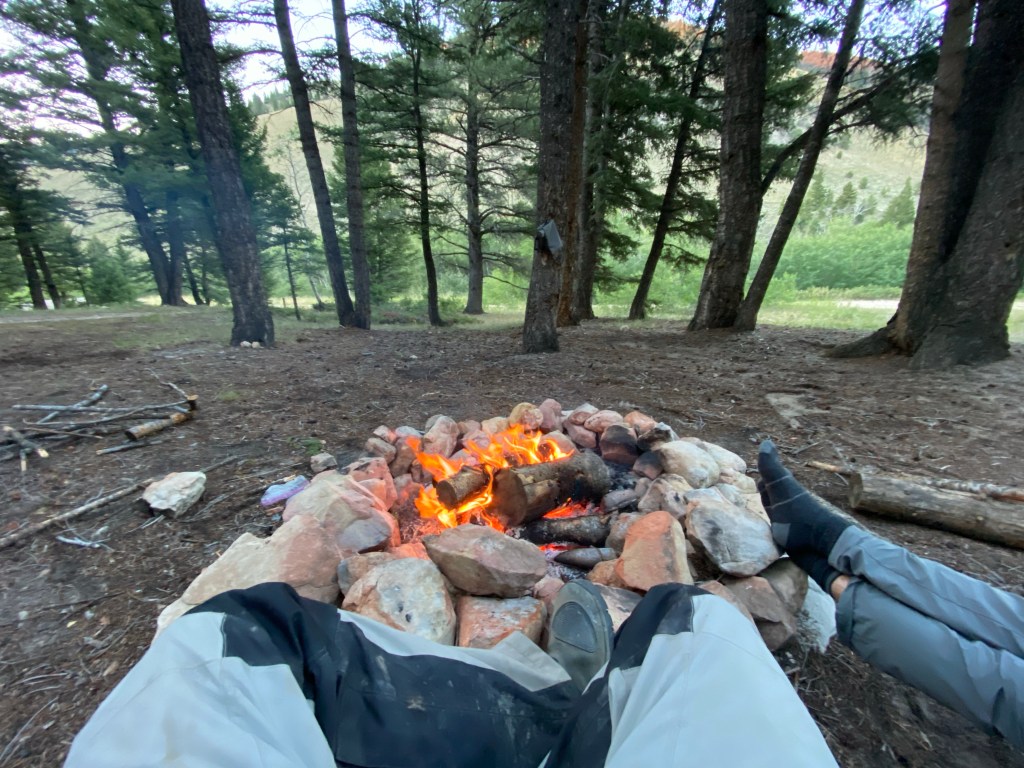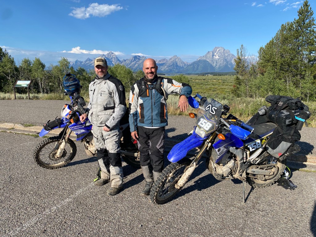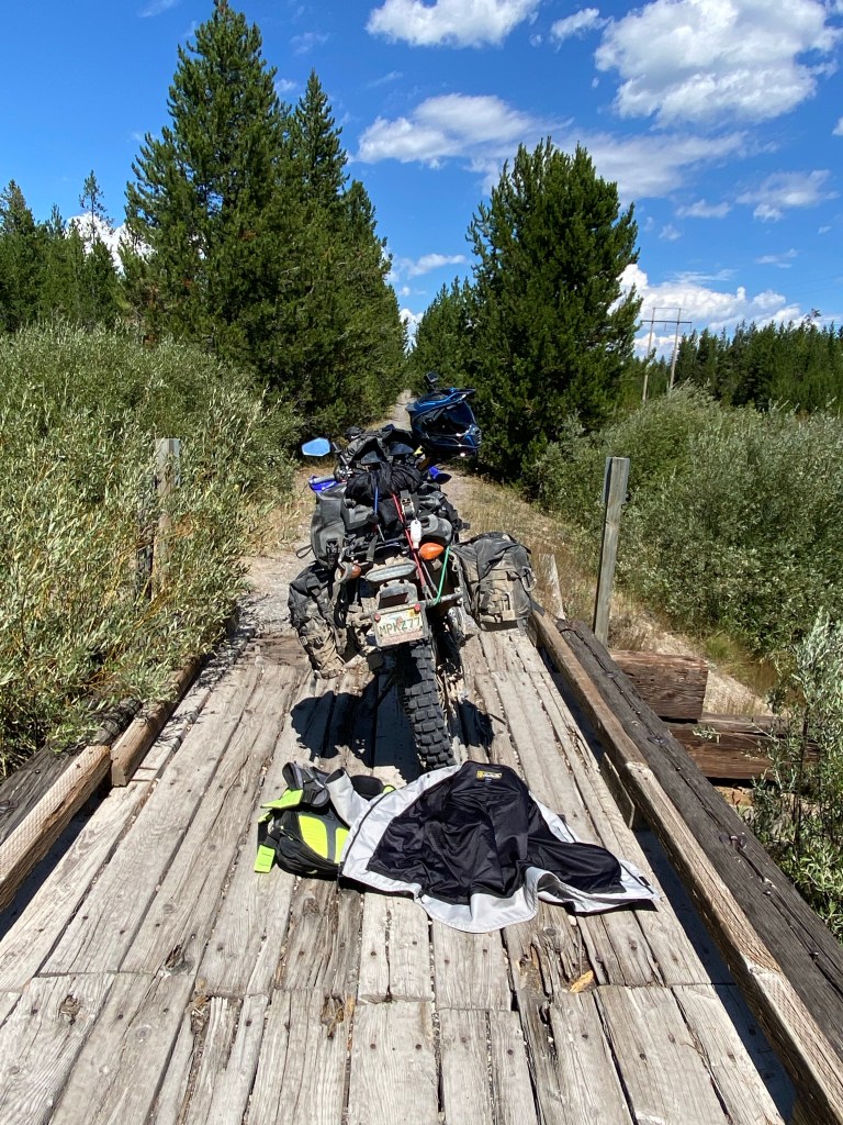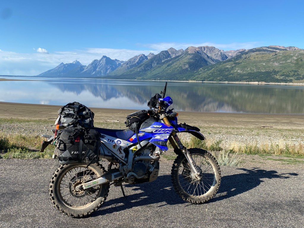 Started the day at the lodge. It was nice to get a shower, meal at the restaurant and a chance to do laundry and repack. We loaded up the bikes, grabbed a coffee and head out. By coincidence, the trail system was right behind the lodge property so it was really easy to get on it. It rained quite a bit during the night and the trails were extremely slippery and muddy. It was the same type of mud that cakes on top the tires and encases everything. It was difficult to keep the bikes upright for a couple miles. We eventually came across a part of the path that was rocky so we were able to get some speed and knock all the mud off the tires. Though we saw them from a distance the day prior, we made our way to Grand Teton National Park. Once inside the park we followed the flow of traffic and ended up at a scenic pull off and took some pics of the mountains. After that we continued on our path which lead us to a gravel/dirt trail system. We continued on this for miles and eventually found ourselves out in the country surrounded by wheat, potato, and hay fields. There was such a drastic change in scenery from the farm community countryside compared to the twisty mountain roads. A lot of it reminded me of SW Wisconsin. Rolling hills, old barns in need of repair and hay everywhere. Next we ended up on the Idaho Scenic Trail System 001. The first couple miles of it ran along side a gorge with really clear/blue water in it. This trail system was about as wide as a large four wheeler/side by side and was LONG. It was loose sand/rock and was whoop after whoop the entire time. Matt compared it to a suspension torture test track. Probably 40 minutes in, Matt noticed fluid coming out of his right fork. This meant there was a failure of the ring or perhaps debris caught up in there breaking the seal. We pulled over and called Travis. He’s the one in VA that built our suspension. He told Matt over the phone how to fix it on the trail so we worked the problem. We had to lay the bike on its side, pull the fork dust cover off, clean all with a rag and then cut a water bottle into a scoop shape then use that to dig the dried dirt out of the fork seals. We did all that and it seemed to work. We diverted to a paved road to give the suspension a little break. We found another gas station, filled up and continued. We hit another part of the gravel trail and out in the middle of nowhere we ran into Gary. He had an older large suv and was pulling a homemade travel trailer. We noticed he was trying to change a blown out tire so we stopped and helped him out. His first spare tire was too big to fit but he had a smaller tire so we mounted it for him and sent him on his way. Visually he looked like a combination of The Prospector from Toy Story, Uncle Jesse from The Dukes of Hazard and Charlie Daniels. After that we continued on for another 40 plus miles on this gravel road and found a campsite by a mountain lake. The site was surrounded by marsh and had zero shade. It was still early in the day so we looked at the gps and found a different site over an hour away. We jumped on the bikes, headed to Lima, MT and found a gas station in town. We filled up and then rode another 20 minutes to the most secluded and tucked away campsite yet. There were 10 spots and we had the place to ourselves. Once we dropped off our gear at the site we took the bikes and went to all the fire pits, strapped all the wood we could find to the bikes and build a large fire after we setup our camp. After that we had dinner, hung the bear bag in the front of the park close to the entrance and went to bed.