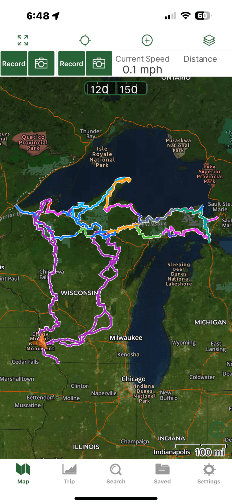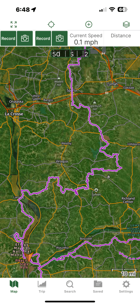 From Cedarville, IL I shot back up to WI and made my way to Prairie du Chien and stopped at my Aunt and Uncle’s house for the night. I didn’t get there until 8:30, but they were patient enough to wait for me before firing up the grill and throwing the steaks on. The attached map screenshots show the overall trail system with alternate routes for difficulty and the other is what I’ll probably ride today (Saturday). I don’t really have a day by day plan, just going to go and see where I end up. The attached vid at the bottom shows I was going 101 mph at one point, nope, mid 70s if that. That app has always been way off on speed for some reason.