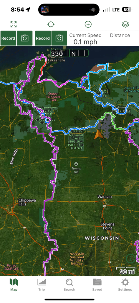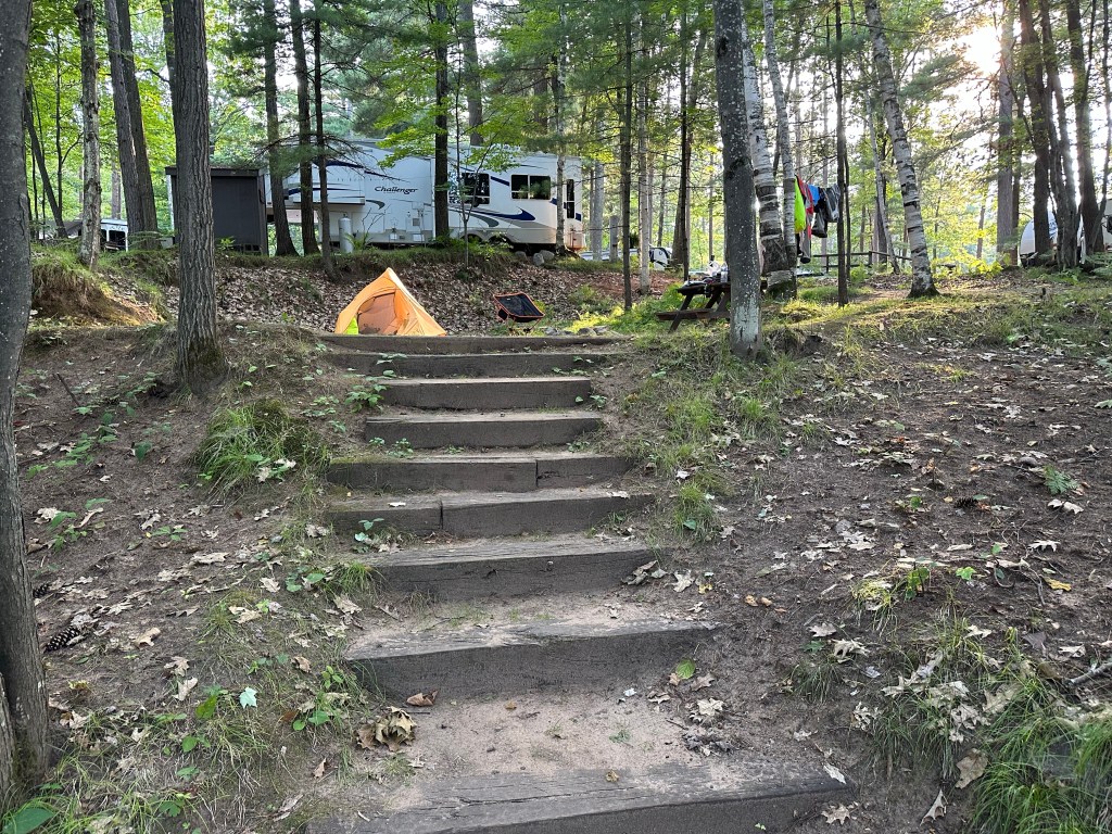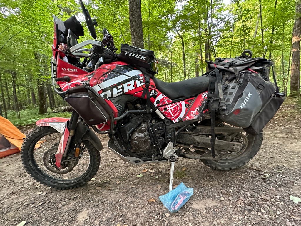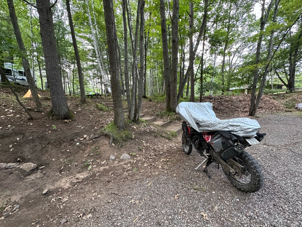 Here comes a massive paragraph… On this trip I’ve come to cherish device battery life more than proper paragraph structure so I’m typing as quick as I can on this iPhone. I Woke up this morning in a gorgeous, heavily wooded United States National Forest next to the Chequqmegan Waters Flowage. Nope, not a clue to which town I was near. Guessing I got about 4 hours of sleep all night. Two things kept me up. The spot next to me had I’m guessing a 40 foot diesel pusher in it and they were boon docking off the grid. Once an hour for 15 minutes or so at a time something would kick on and make a weird high rpm noise. For those of you that have worked on jets be it fighters or heavies it sounded like the JFS firing up but quieter. No idea what that was, but is was annoying as hell. Then on the first night my air mattress failed about 5 minutes after I blew it up. That’s the one piece of gear I didn’t conduct redundant checks before heading out. As soon as it went flat I remembered it failed probably two nights before we wrapped up the big trip last year. My bad for not checking it. The campsite was rocky and had a fair amount of gravel. I couldn’t get any tent stakes in so the tent was free standing. I have bruising on the left and right rib cage from attempting to sleep on that.. oh joy. I brought an ultra light summer weight tent so pretty much zero padding between me and the ground. I still had an oil leak issue to deal with so I googled (rare to have cell coverage in the middle of nowhere but I did) common T7 oil issues and Yamaha dealers nearby.. so what does nearby mean when in the woods? Well, Tomahawk had one 47 miles away the there was another 53 miles away. To my surprise they were both open Monday. Most Power sports places are closed Sundays and Monday’s. They both opened at 9 so I broke down camp and then looked at the bike. I had quite a large amount of oil all over the back of the engine, a pool of oil on top of the skid plate (gut guard), all over the swingarm, down the center stand, on the back rim and a pool in the gravel below.. well, that wasn’t good. I checked the oil level window and it was down a hair but not bad enough I wouldn’t ride it. Once packed up I headed to Tomahawk 1 hr 15 minutes away and went to the Yamaha dealer. Long story short the tech pretty much said three weeks to get it fixed. I tried three other places and they all said two three week range. At that point I decided the trip was over and started thinking about how I could burn at least half a week up here since I was on vacation anyway. There was a place called “The Birches” on Boot Lake about 1 hr and 20 minutes away via main roads that I’ve been to multiple times over the years. I called the owner and due to a personal issue they were going to close down for the next few days so I couldn’t stay there. next I went to the Yamaha dealer in Minocqua which just happened to be next door to the laundromat. I talked to the senior tech and at first he told me they work on all Yamaha products but motorcycles -go figure. He then told me he just transferred up there from Madison where he was a motorcycle tech at the same dealership I use. He talked it over with his manager and parts person and they told me they would fix it. It was mostly side by sides, snowmobiles and watercraft. He told me it appeared the crank case gasket failed and needed replaced. Of course they didn’t have one so they ordered it and I should have it by Wednesday morning. After that I went next door and did some laundry. I had two choices, burn those nasty ass clothes or hit a laundromat. Oh it was bad lol. While I was waiting for all that to finish up I started looking for a campground and the first one that popped up was Patricia Lake Campground about two miles outside of Minocqua. After that went to Walmart and bought another micro camping air mattress and some other stuff. Then Headed to the campgrounds, signed in, bought a couple bundles of wood and setup camp. Oh, made a beer run to the gas station as well.. I mean, it’s not like I have a cooler. Tomorrow I’ll probably rent a paddle board and hit the lake. I also need to work some maintenance on the bike . Going to check every panel fastener and bolt I have access to. I built a tool kit to keep weight down for basic stuff. Anyways, the fire is getting low so I should go get another bundle of wood before it gets too dark .