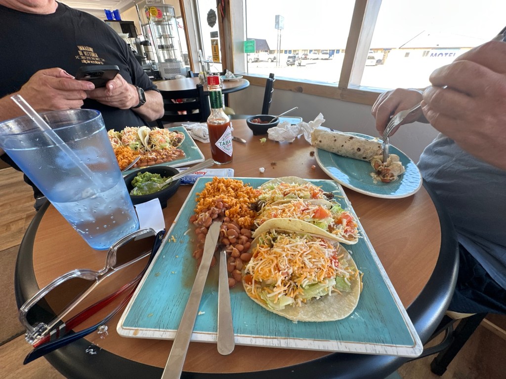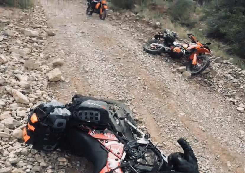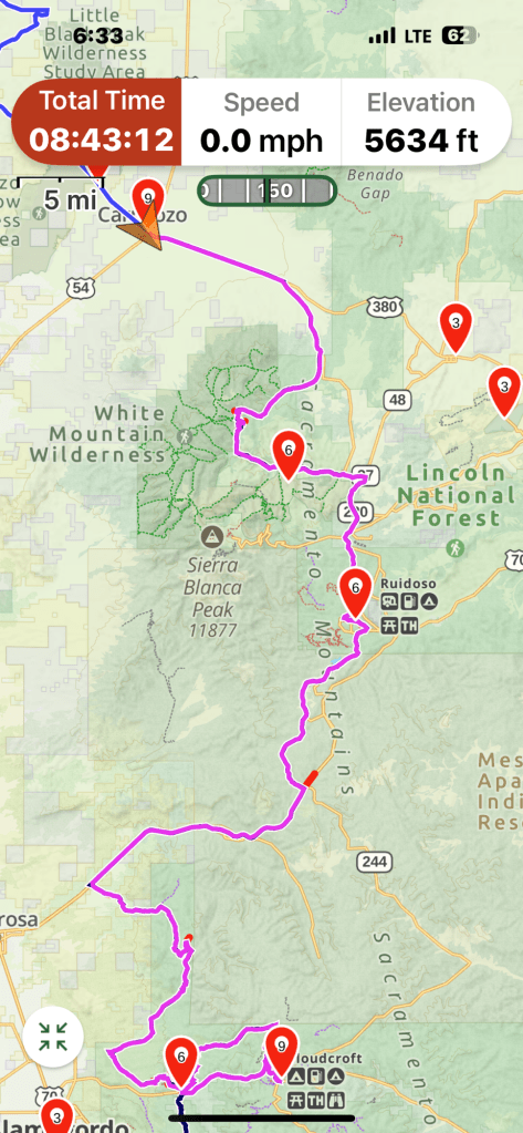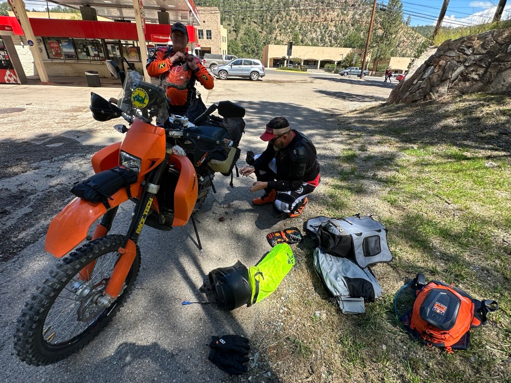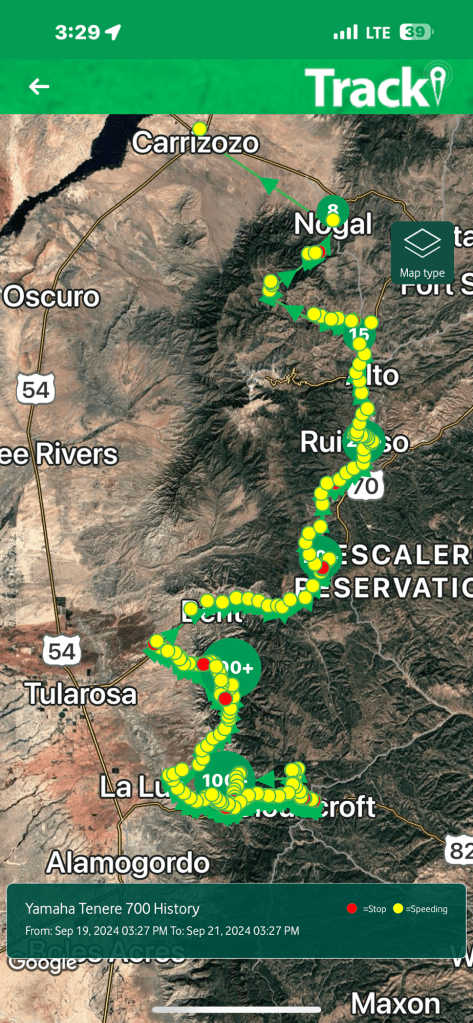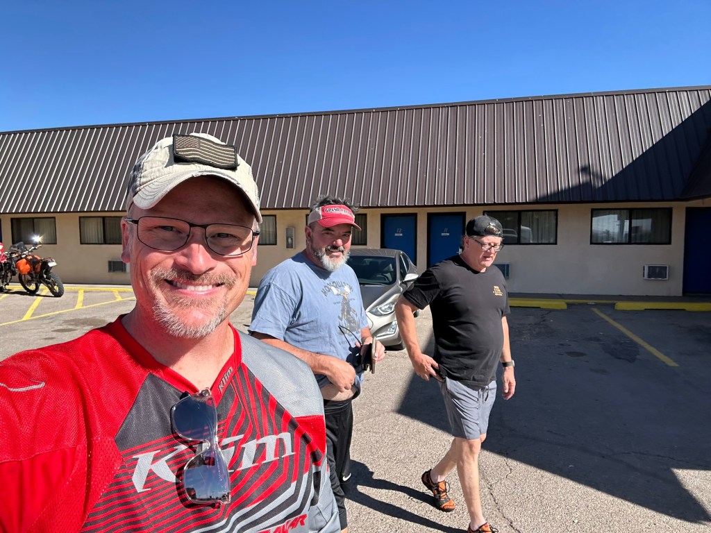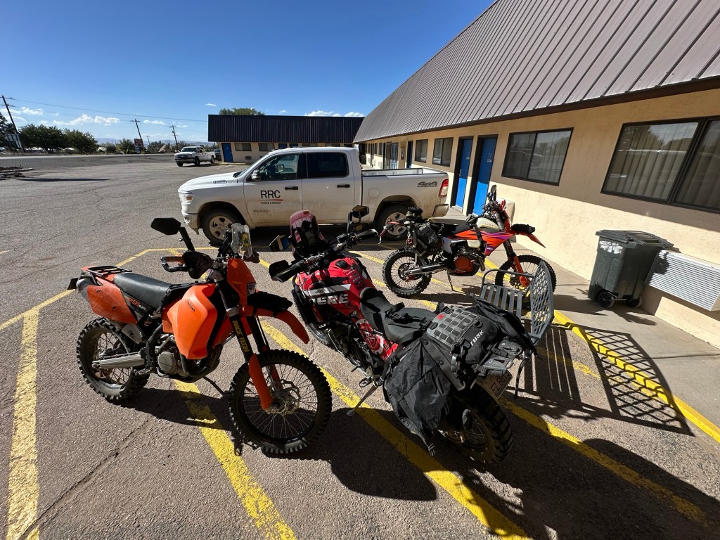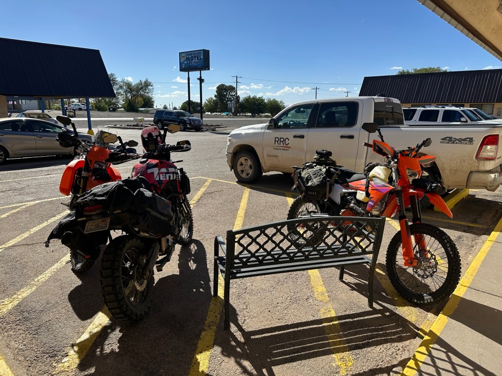 We woke up at 6 from the Airbnb cabin in Cloudcroft, hoping to head to breakfast around 6:45 – well, that didn’t happen. Once again, the sky opened and dumped for 15-20 minutes. After a bit, we eventually made our way to a little place called Big Daddy’s Diner in Cloudcroft and had a fantastic breakfast. We topped off on gas in town and started messing with our radios. We had difficulty getting all 3 radios to send/receive for a big chunk of the day. Two radios would be good, but the third had issues. From there, we started the trip. The day consisted of fast dirt/rock mountain trails, steep switchbacks, and blacktop. I don’t exactly remember where we were, but there was a moment when Ron had his first bike dropped off during the trip. The funny thing is I was right behind him when it happened. I pulled up, put my stand down, and realized the ground right of the bike was lower than the left. When I put my right foot down, there was nothing there, and in turn, down went the second bike. It made for a great photo op and a few laughs. First thing in the morning, Jeff noticed his bike would sound like the rear suspension was bottoming out on the most minor bumps. It got a little worse as the day went on, and then there was a point where an additional noise came from the back. We found shade behind a gas station in Ruidoso so he could get into the bike and see what the problem was. At first glance, he noticed the rubber knobs of the rear tire had chunks of rubber sliced off them. Then, the chain was dug into the chain guard on the left side. First, he took some slack from the chain, fixing the additional noise he heard. The big issue was that when the suspension would compress, the tire would collide with the inboard side of the muffler, slicing rubber during each compression. The aluminum band holding the heatshield on acted like a big knife. A couple of reasons for this. First, the rear tire was a hair wider than a stock one, and second, it appeared the slip-on muffler was more inboard than most bikes have. As the guys were diagnosing the problem, Jeff sent me to Ace Hardware with the stock muffler attachment bolt to see if they had one 3/4 inch longer. This extra length, combined with 10 washers used as spacers, created just enough clearance to where the tire no longer hit the muffler. It’s not pretty, but it fixed the issue. We all packed up and continued on. We rode for numerous miles through remote wooded mountain areas, and the elk hunters and a handful of campers were out in full force. Most of the path was fast but had a handful of loose rock areas. After that, the tracks led us to the highway, and we ended up at the Four Winds Motel in Carrizozo, NM. We checked in, unpacked, and walked to a little diner across the street. We still need to review the bikes, check for loose bolts, and ensure all is good. Tomorrow is going to be a sketchy day. We will be on the west side of the White Sands Missile Test Range. This is the sand day. I haven’t had the Yamaha on sand yet, so it will be interesting, to say the least. The good news is that my Garmin GPS decided to work again, which will be massive compared to trying to follow a little line on my phone.