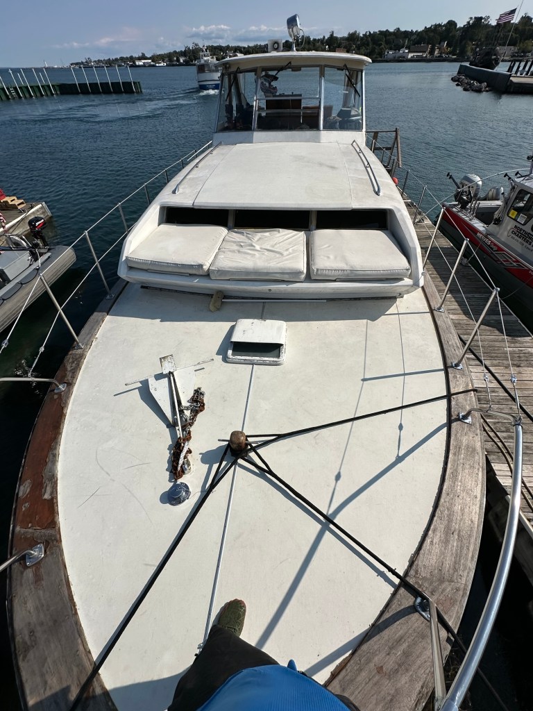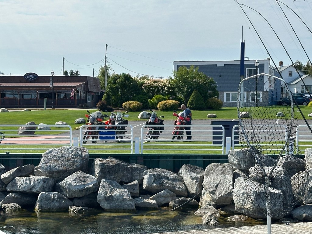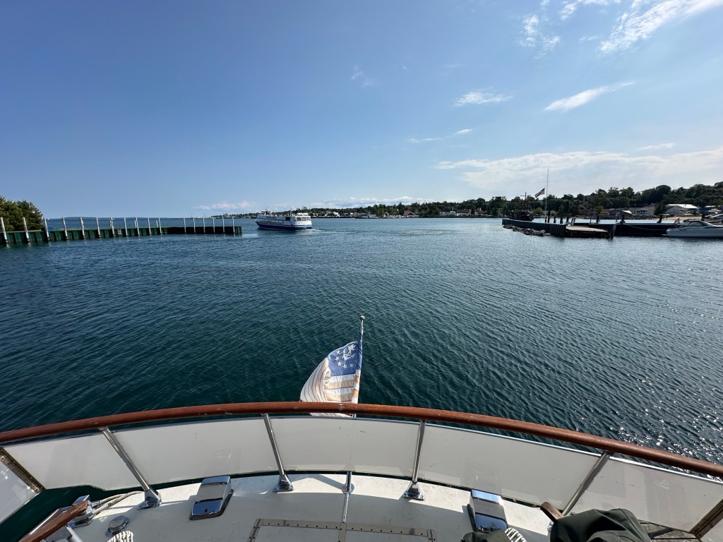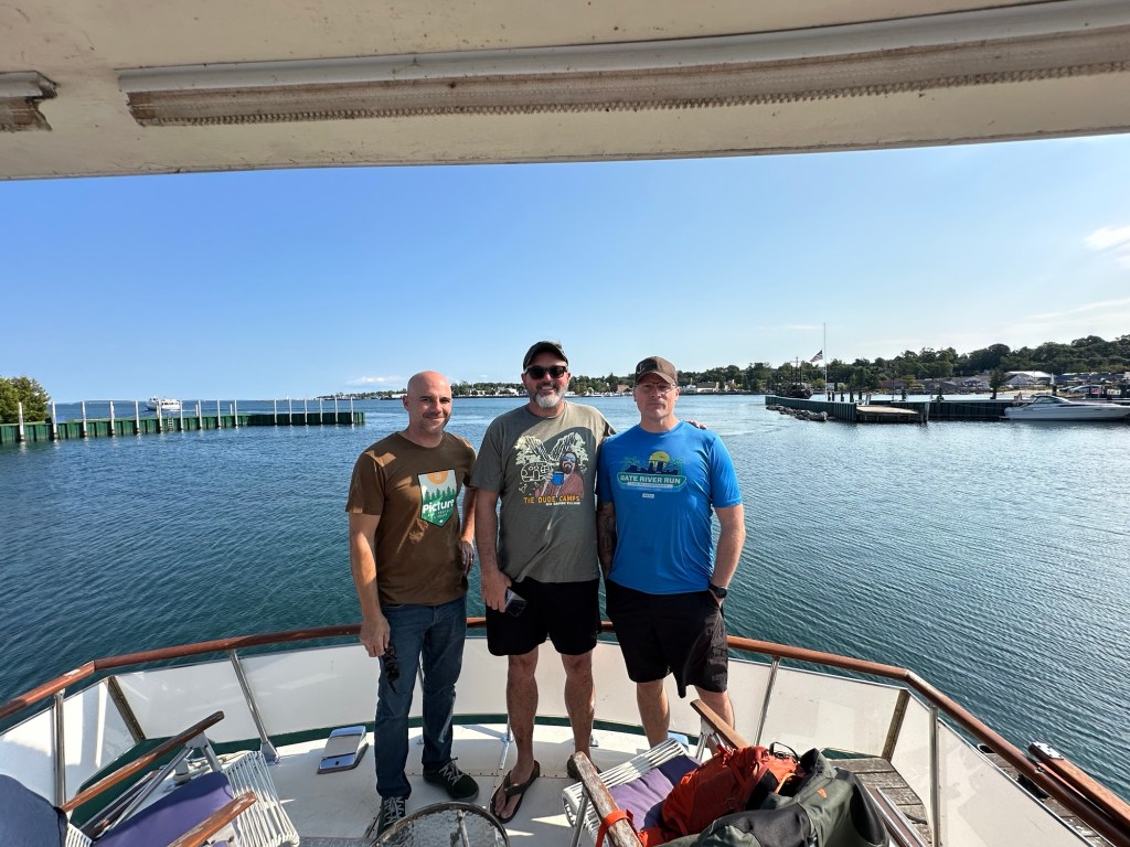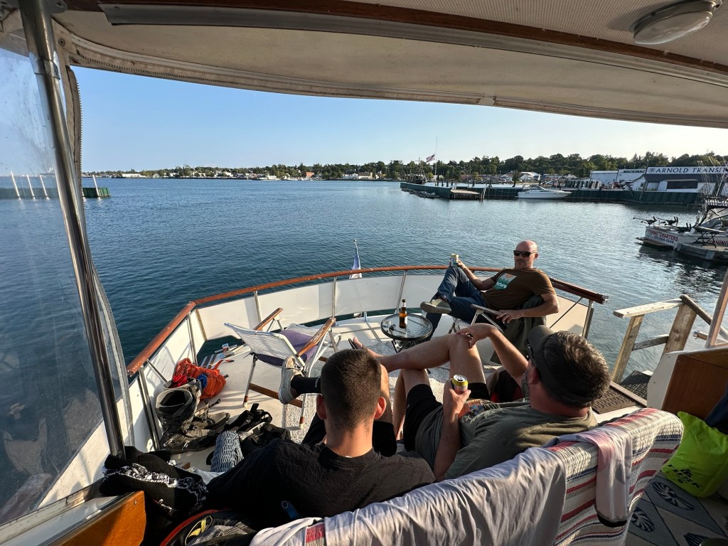 The views were endless, the waves were crashing, but the water was cold. From there, we jumped back on the bikes and continued on. We had some fast backcountry gravel, ending up in St Ignace. Our Airbnb for the night was a yacht from the late 60s. It slept 5, had two bathrooms, and the back deck faced south. We were close, about 200 yards from the Mackinac Island ferry, so watching that go in and out was fun. We had dinner across the street at a sports bar, grabbed some beers from the local Dollar General, and are currently drinking a Leinenkugel’s Summer Shandy on the back of the boat while typing this up.