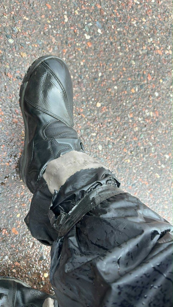 When we first set out that morning, it wasn’t exactly pouring just yet, but there was a light drizzle. We all had our riding jackets, pants, and protective gear on, along with our rain gear. Despite the prep, during the day, some of the rain was so heavy that it still seeped up the sleeves or down the neck at the back of our helmets. My rain pants were so worn out that I had to tape them to the bottom of my riding pants with electrical tape just to keep them in place. It helped keep the water out of my boots.