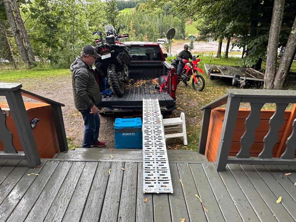 It’s been a month, so I’ve forgotten some of the minor details about that day, but long story short, it was cold and wet, and we ended up diverting S/SE back to Iron River, MI, instead of heading W/counterclockwise for the long haul. This diversion cut half the distance out of our day, but we were ready to wrap things up. The quickest route back to the Vrbo was all blacktop/highway in the rain. After hours of white-knuckling it on the highway with low visibility, sharing the road with semis and larger vehicles, it was a relief to finally switch to less-traveled roads and head back to the ski chalet. There, we changed out of our wet clothes, relaxed for a bit, went out to eat, and then loaded up the bikes for the trip home the next morning.